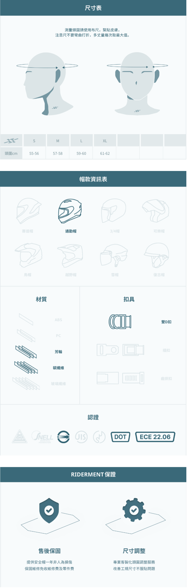 ・帽殼材質:4種帽殼尺寸,5片分離式EPS,鎖骨安全設計,碳纖維-芳綸複合纖維