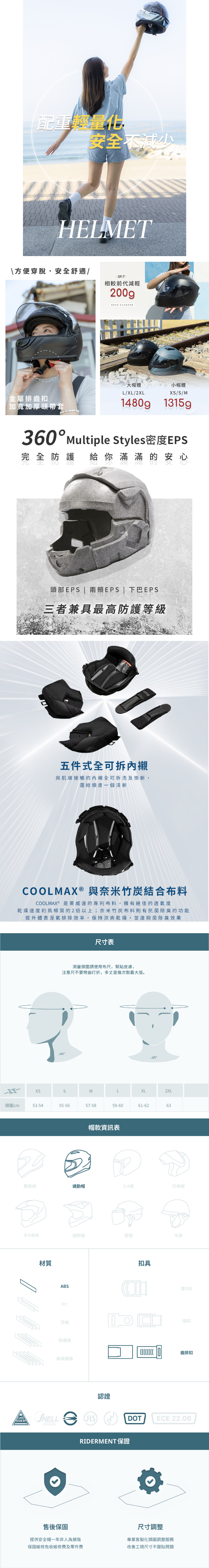 ・內襯系統:五件式全可拆內襯,採用奈米竹碳與COOLMAX結合布料