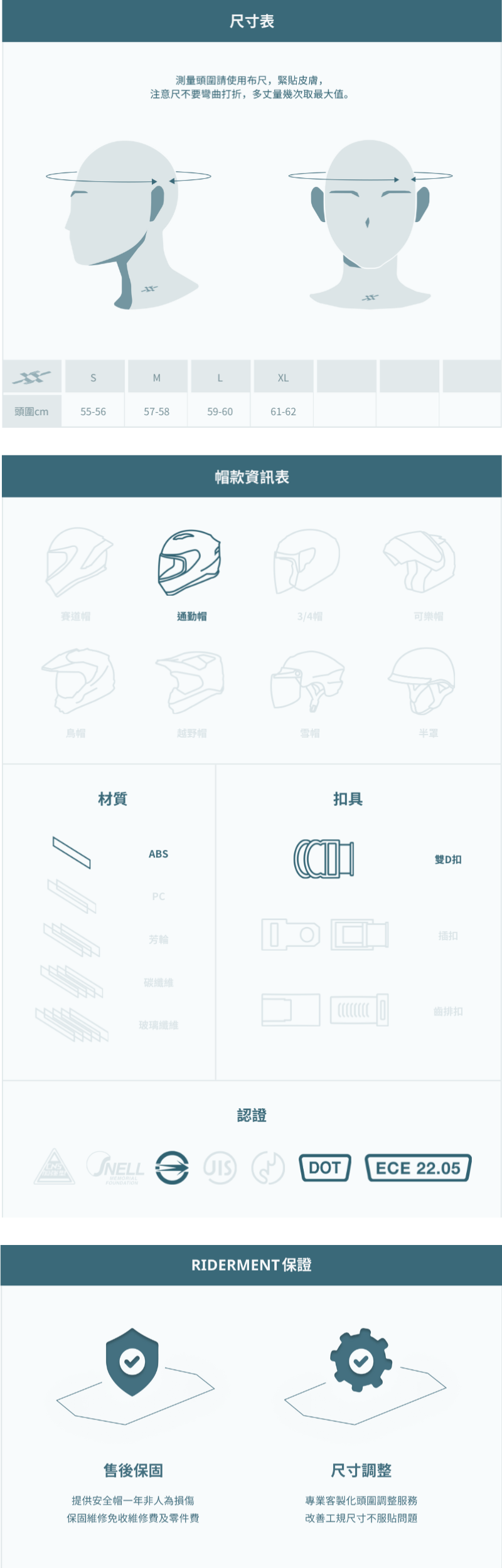 帽殼材質:3種帽體大小、4片分離式EPS、鎖骨安全設計、高耐熱ABS外殼