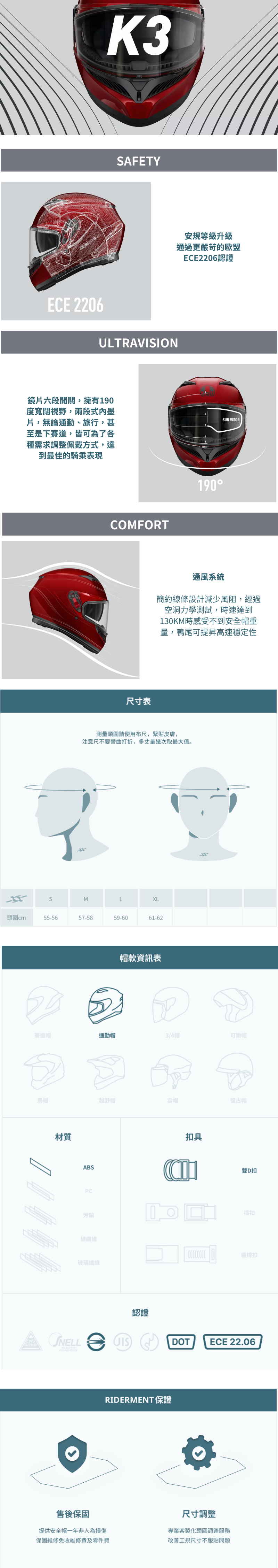 帽殼材質:3種帽體大小、5片分離式EPS、4種EPS尺寸、賽事等級鎖骨安全設計、高耐熱ABS外殼