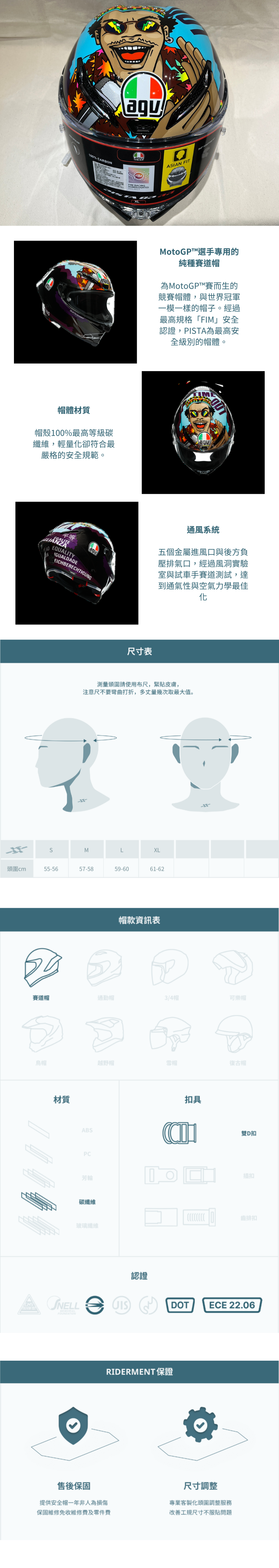 安全規格:ECE 2205 (歐盟安規)、FIM認證 (賽車協會頂級安規認證)