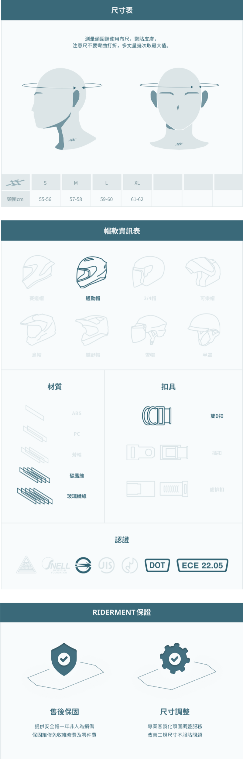 ‧帽殼材質:碳纖維+玻璃纖維、3種帽殼大小S、M、(L、XL)、4片分離式EPS、鎖骨安全設計